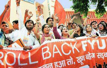 The Delhi University Teachers Association (DUTA) and several other student organisations like NSUI, ABVP, AIDSO, AISA, AISF, CYSS, DSU, INSO, KYS, NEFIS, PACHHAS, SFI and SYS have demanded roll back of the four-year programme and also insisted VC’s resignation.