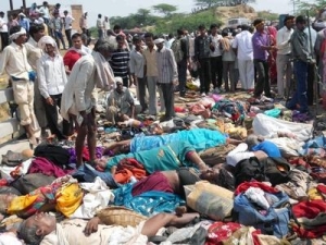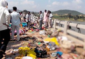 The incident took place when a rumour of collapsing the bridge over Sindh River surfaced on Sunday the afternoon as the devotees were crossing the bridge. In panic people rushed to the cross over to the other side and started pushing each other. When Police tried to control the situation by launching lathicharge, the whole situation got out of control. Reportedly the clash between police and pilgrims resulted stampede, followed by killing and injuring hundreds of people including children.
