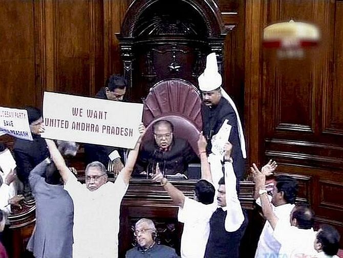 members so lined up by the ruling UPA. The video footage broadcast in the national media shows at least one pro-Telangana female MP in the well of the House!) These strategists are said to have deployed some MP’s to block the Seemandhra MP’s since BJP is said to have objected to the use of marshals to handle the protesting Seemandhra MP’s. This too marks a low in the conduct of our legislatures. When did our legislatures become battlegrounds where the strategies adopted by either side are akin to those adopted in a battlefield? Isn’t this an unfortunate decay of our legislatures? If the MP’s from Seemandhra have been protesting – across party lines – against the T-Bill, is it not the duty of the government to sit with them, hear them out patiently and with sincere empathy rather than force the Bill down their unwilling throats by using coercive, undemocratic methods? Can the government rightly say that it has been upholding sacred democratic traditions and practices in their true and proper spirit?